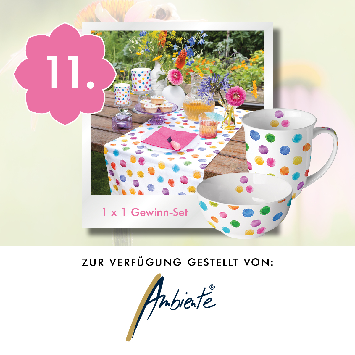 Inspiriert von den Modetrends von Mailand bis Paris bringt AMBIENTE EUROPE mit der farbenfrohen Kollektion „Polka Dots“ Glücksmomente und gute Laune in unser Interieur. Das Gewinn-Set besteht unter anderem aus Henkelbechern, Wassergläsern, Kerzen, Streichhölzern, Servietten, einem Tablett und praktischen Tischsets.